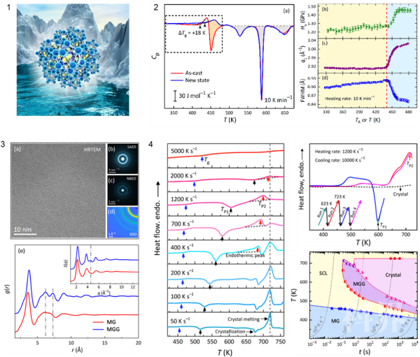 研究人员从热力学、多尺度结构和声子动力学“玻色峰”三个角度,对金属玻璃的超快年轻化过程进行了全面研究,揭示出玻璃结构年轻化源于纳米尺度团簇以“剪切转变”模式诱导的自由体积产生。基于这一物理机制,定义了一个无量纲Deborah数,解释了金属玻璃超快年轻化的时间尺度可能性。该工作使实现金属玻璃结构年轻化的时间尺度提高了至少10个数量级,拓展了这类材料的应用领域,也加深了人们对玻璃超快动力学的认知。
