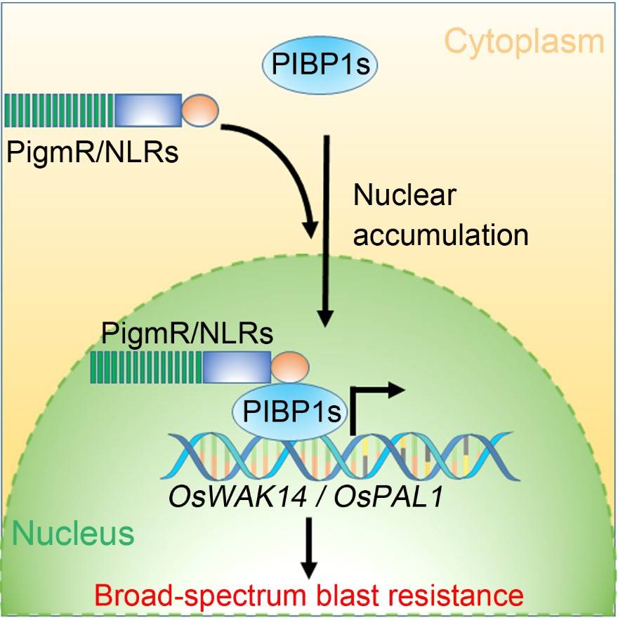 该团队以一个苗期稻瘟病抗性减弱的水稻突变体为材料,通过图位克隆的方法获得了一个编码环核苷酸离子通道蛋白的基因OsCNGC9,该基因对水稻苗期稻瘟病抗性具有正向调控作用。OsCNGC9被进一步鉴定为一个钙离子通道蛋白。在水稻PTI过程中,OsCNGC9积极调控PAMP诱导的胞外钙离子内流、活性氧爆发和PTI相关基因的表达。进一步研究还发现,一个水稻PTI相关的类受体激酶OsRLCK185可以与OsCNGC9互作,通过将其磷酸化从而改变其通道活性。使OsCNGC9过表达可以显著提高水稻的PTI反应和苗期稻瘟病抗性,这初步展现了OsCNGC9在水稻抗病遗传改良中的潜在应用价值。