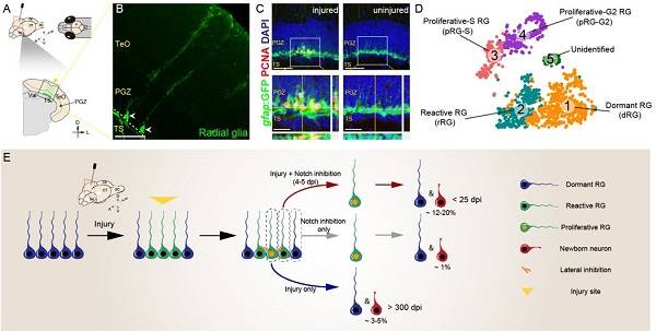 图注:A.成年斑马鱼中脑视顶盖损伤示意图;B. 稀疏标记的中脑视顶盖放射状胶质细胞;C.损伤引起静息态放射状胶质细胞增殖;D.单细胞测序分析显示损伤后的视顶盖存在着三类放射状胶质细胞:静息态、激活态和增殖态。E.模式图:损伤引起损伤位点下方所有静息态放射状胶质细胞转变为反应态;只有25%反应态细胞转变为增殖态;此过程受到Notch/Delta介导的侧向抑制调节;在损伤条件下,增殖态放射状胶质细胞主要进行胶质增生,产生~3-5%的新生神经元;新生神经元可以存活至300天;在Notch信号通路抑制条件下,静息态放射状胶质细胞可转变为增殖态,但只产生~1%新生神经元;然而,在损伤后特定时间窗口(损伤后4-5天)抑制Notch信号通路会驱使反应态放射状胶质细胞进入细胞周期,这些细胞会产生更多的新生神经元(~12-20%);这些新生神经元中的绝大部分却只能存活少于25天。
