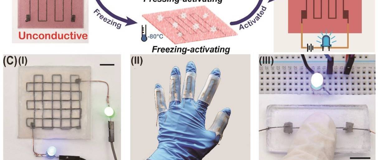 中国科学院青岛生物能源与过程研究所研究员李朝旭带领的仿生智能材料研究组,通过将LM在海藻酸盐溶液中超声处理,制备成包覆有海藻酸盐微凝胶的LM微纳液滴。在超声的过程中海藻酸盐不仅可以通过羧基与Ga3+配位促进粒径的降低,而且可以螯合Ga3+形成微凝胶,从而抑制Ga3+的进一步释放,提高了材料的生物相容性。包覆海藻酸盐微凝胶的LM分散液不仅增加了胶体稳定性和化学稳定性,还可以大幅增加其与柔性基底的亲和性,可用于电子墨水。虽然微纳液滴组成的电路由于氧化层外壳呈现绝缘状态,但是可以通过外加压力的方法恢复其导电性(4.8×105 S m–1)。这种电路可应用于可穿戴微电路、电热驱动器和电子皮肤等领域(图1)。相关成果已发表在《先进功能材料》(Adv. Funct. Mater. 2018, 28,1804197)上。
