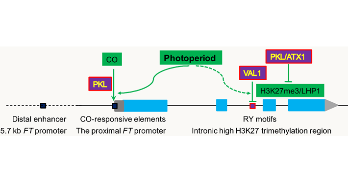 太阳光提供给植物能量以及波长、周期、强度和方向等信号。高等植物监测日照长度(即光周期)的变化,通过调节开花时间以确保繁殖成功。日照长度由叶片感知后诱导成花素基因FT在维管束的表达,FT编码的成花素由叶片转移至茎顶端分生组织,促进植物开花。长日照下,FT被光周期输出因子CO在韧皮部于黄昏时(dusk)特异激活,CO-FT调控单元是光周期途径的核心调控模式,CO结合在FT靠近转录起始位点的近端启动子区从而激活其表达。