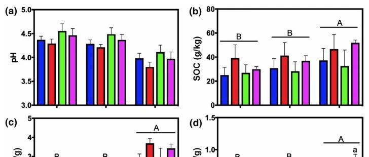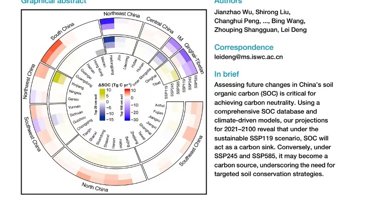 本研究利用美国国家生态观测网络站点的表层矿质土壤,结合核磁共振波谱法和分子混合模型定量不同生态系统土壤有机碳的化学功能团的相对丰度。结果表明,土壤有机碳中的碳水化合物、脂质、蛋白质、木质素和焦炭在不同生态系统中的相对丰度差异很大,但每种化合物的总体平均丰度相似。主成分分析结果表明木质素和蛋白质之间显著负相关,碳水化合物和焦炭之间显著负相关。以上结果表明,大陆尺度上的土壤有机碳分子组成之间存在一定的权衡关系。本研究还发现土壤铁铝氧化物和pH最佳解释了土壤有机碳化学组成的变异,而且这些环境因子与已知的预测土壤有机碳含量的环境因子基本相同。