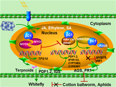 图2. 双生病毒操纵植物免疫来抑制非介体昆虫的工作模型:βC1,双生病毒β卫星链编码的效应蛋白;JA,茉莉酸;SA,水杨酸;IGS,吲哚类芥子油苷;AGS,脂肪族芥子油苷。Cotton ballworm: 棉铃虫,aphids: 蚜虫。