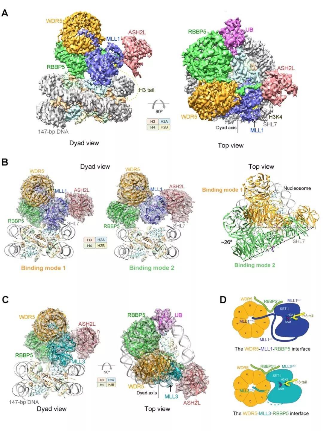 人源MLL1复合物和MLL3复合物与泛素化修饰核小体(ubNCP)及未修饰核小体(NCP)的冷冻电镜结构。(A)人源MLL1-ubNCP 复合物的冷冻电镜结构密度图。(B)人源MLL1复合物在未修饰的核小体表面呈现两种不同的结合模式。(C)人源MLL3-ubNCP 复合物的电镜结构密度图和结构模型。(D)调控MLL1和MLL3复合物的底物特异性的结构机制模式图。