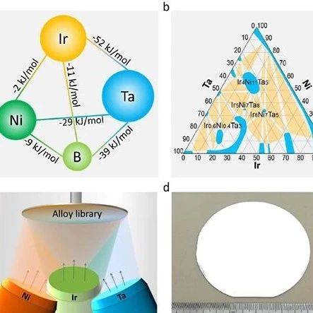 图1. Ir-Ni-Ta-(B)高温非晶合金的设计以及高通量实验方法。该方法一次可实现1000个成分点以上的快速制备和表征,比传统非晶合金探索方法效率高1000倍以上。