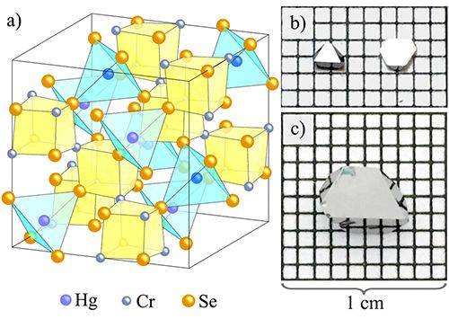 图1. Hg的晶体结构图(a)及实验中使用的单晶照片(b, c)