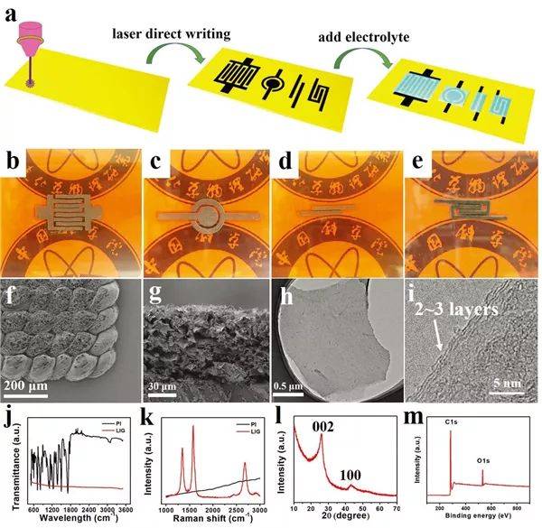 微型电子设备, 如微型机器人、便携式电子设备和植入式医疗设备的快速发展极大地促进了市场对微型化储能器件的需求。当前, 微型储能器件主要分为两类: 微型电池和微型超级电容器。微型电池虽然具有较高的能量密度, 但其循环寿命较短、充放电速率较慢, 很大程度上限制了其在高功率密度器件中的应用。相比微型电池, 微型超级电容器(micro-supercapacitors, MSCs)是一类高功率型的电化学储能器件, 具有功率密度高、充电时间短、使用寿命长等特点。按照储能机制来说, 微型超级电容器分为电化学双电层电容器和赝电容电容器。前者是通过电极表面离子的吸附/脱附来实现电荷的储存和释放, 要求活性材料具有较高的比表面积, 如活性碳和石墨烯(graphene)。后者则是通过赝电容电极材料发生可逆的法拉第反应来完成能量的转换, 如MnO2和VS2。由储能机制可以看出, 使用赝电容电极可以得到更高的能量密度, 但同时, 赝电容材料有限的充放电循环稳定性会损害其超长寿命。这是因为充放电过程会破坏赝电容材料的结构完整性、电子性能和电化学行为, 从而影响赝电容超级电容器的使用寿命。解决此问题最常用的方法是将赝电容材料与机械性能优异的碳基材料进行复合。因此, 可以将双电层电容和赝电容两种机制结合起来进行能量存储, 有望同时实现器件高能量密度和高功率密度的表达。石墨烯是一种由碳原子以sp²杂化轨道组成六角型呈蜂巢晶格结构的二维纳米材料, 比表面积高达2620m2/g。由于结构内大π键的存在, 石墨烯具备优良的导电、导热、光学性能, 以及良好的韧性, 并且其化学性能稳定, 同时是强度最高的材料之一。这些优异的物理化学性质使得石墨烯材料的应用十分广泛。为此, 我们前期围绕石墨烯纳米材料开展了相关研究工作, 实现了系列功能化石墨烯材料的构筑, 如超轻的氮掺杂三维石墨烯、石墨烯纳米筛、高导电石墨烯薄膜和大片耐火耐热的石墨烯纸。同时, 开展了石墨烯在产电能量转换与存储方面的相关应用研究, 制备了系列石墨烯基储能器件, 如金属/氧化石墨烯电池、锂硫电池、高度耐压的超级电容器、纤维状超级电容器和全固态柔性超级电容器。微型超级电容器的器件结构主要有两种: 一种是由两个薄膜电极、固体电解质构成的三明治结构; 另一种是两电极处于同一平面并且具有一定物理空间距离的结构. 传统三明治结构的超级电容器存在以下局限性: (1) 隔膜上下两侧电极的紧密接触不可控; (2) 该结构不能有效地平衡能量和功率性能。随着活性电极材料负载量的增加, 器件的能量密度会有所提升, 然而离子扩散路径的延长将影响器件的功率密度。而微型超级电容器中平面电极的设计, 保证了离子传输路径不因电极厚度增加而发生变化, 并且不需要隔膜类材料, 很大程度上降低了界面接触电阻。因此, 平面电极的设计为微型储能器件同时获得高能量和功率密度提供了机会, 而且能够与商用电子器件集成, 在瞬间提供有效的功率峰值, 引起了学术界广泛的研究。为此, 人们发展了多种合成技术和手段来制备石墨烯基平面微型超级电容器。例如, 2011年, Gao等利用激光直写技术制备了不同构型的石墨烯平面微型超级电容器。该微型电容器在没有外加电解质的情况下, 仍然表现出相当的电荷存储能力。2013年, Niu等采用光刻技术和选择性电泳相结合的方法制备了全固态石墨烯柔性超薄平面微型超级电容器, 性能远超过传统微型超级电容器。同年, Wu等利用氧化刻蚀技术获得了高性能的石墨烯微型超级电容器。此外, 研究人员还通过喷墨打印、挤出打印等多种方法制备了微型超级电容器。尽管上述方法能够实现石墨烯基平面微型超级电容器的构建, 但存在一些缺点。例如, 采用氧化刻蚀技术进行微器件制备时, 首先需要模板协助才能完成金属集流体材料的沉积; 其次需要把多余的活性材料洗掉, 不仅操作烦琐, 而且造成材料的浪费; 喷墨打印方法能够简单的以非接触的方式实现集流体材料的构建, 在一定程度上节约了成本。但是, 可印刷油墨制备过程复杂; 此外, 光刻技术虽然可用于制造微型超级电容器的平面电极阵列, 但该方法后期处理程序烦琐, 限制了其在微器件集成化制造方面的应用. 相比之下, 激光直写是一种非接触式制造技术, 不需要任何模板, 以及苛刻的环境, 可以灵活地设计产品的图案, 甚至可以在一定程度上对材料的结构进行调控, 而且容易与商用电子产品进行电路集成, 具有很大的实际应用前景。鉴于此, 北京理工大学赵扬教授介绍了激光直写石墨烯基微型超级电容器的研究进展, 包括激光构建储能器件的优势、微型超级电容器的电极材料(石墨烯、掺杂石墨烯、石墨烯/碳纳米管、石墨烯/金属氧化物)及微型电级构型组装(对称、非对称)等, 并且展望了激光直写石墨烯基微型超级电容器未来的发展趋势和面临的挑战。
