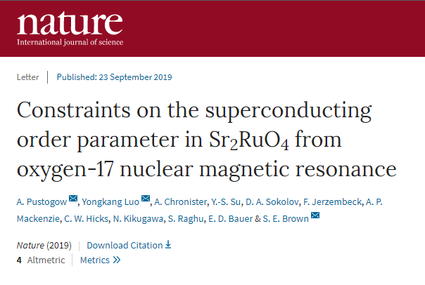 9月23日,《自然》(Nature)杂志在线刊发了国家脉冲强磁场科学中心罗永康教授题为“Constraints on the superconducting order parameter in Sr2RuO4 from 17O NMR”的论文。