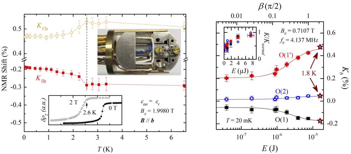 图(左)为单轴应变下范霍夫奇点附近的17O NMR测量的奈特位移与温度的曲线。上插图的应变产生装置;下插图为应变下的超导转变。图(右)为无应变下17O NMR的奈特位移与射频能量输入的曲线。通过对射频输入能量进行控制及量化,证明在无应变下,自旋磁化率在超导前后发生变化。