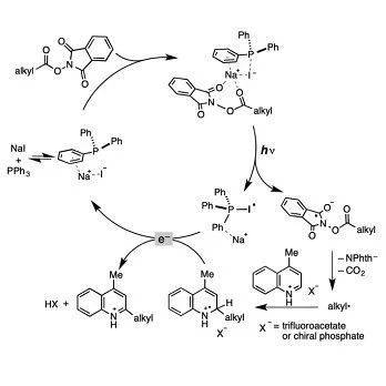 然而,N-酰基烯胺类的烷基化反应一直以来都是一个极具挑战性的课题。南京大学俞寿云教授在此前报道了光催化的N-酰基烯胺与缺电子溴代丙二酸二乙酯之间的偶联反应;罗德平教授课题组也利用钯催化实现了类似的转化,将缺电子的二级烷基引入到N-酰基烯胺。芝加哥大学董广斌教授则利用酮与异吲哚啉-1-酮反应生成的N-酰基烯胺中间体为导向模板,通过烯胺β位sp2碳-氢活化形成乙烯基铱活性中间体,再由该中间体与未活化的脂肪族或芳香族烯烃发生反应,区域选择性的获得sp2-sp3偶联产物。在以上为数不多的例子中,仅限于将二级烷基引入到N-酰基烯胺骨架中,同时需要用到较为苛刻的反应条件。因此,在更温和,更经济,对环境更友好的反应条件下以更宽的底物适用范围实现N-酰基烯胺的区域及立体选择性烷基化反应,成为了亟待解决的热点问题。