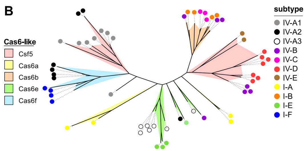 病毒同样进化出多种机制对抗CRISPR-Cas系统,包括间隔序列或PAM的突变和anti-CRISPR蛋白(Acrs)【4】。目前已经发现抑制CRISPR-Cas亚型I-F、I-D、I-E、II-A、II-C、V-A的Acrs,这些Acrs通常具有特异性。但是目前只有低于一半的Acrs其抑制CRISPR-Cas系统的机制是已经确定的,包括破坏CRISPR-Cas效应复合物与DNA的结合和底物的切割。而且,目前没有发现抑制III、IV、VI型CRISPR-Cas系统的Acrs。
