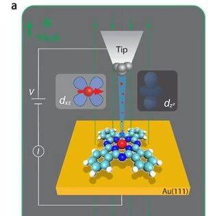 图1. 磁场对金单晶表面单个酞菁铁分子的电子传输路径调控示意图。