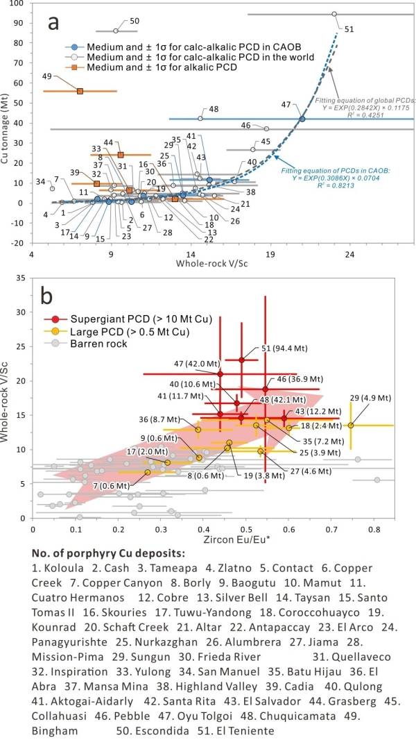 2、冈底斯成矿岩浆高的氧逸度主要有以下三种可能:(1)印度大陆西北缘广泛发育蒸发岩和碳酸盐岩,这些氧化的沉积物随着印度大陆俯冲可以进一步交代上覆岩石圈从而形成高氧逸度环境;(2)高水引发高氧逸度,实验岩石学的工作证实了高水的钙碱性岩浆演化为高氧逸度的岩浆的潜力更大;(3)加厚地壳背景下的岩浆,由于经历了显著地富集Fe2+的石榴石或者角闪石的分离结晶,岩浆会变得更氧化。