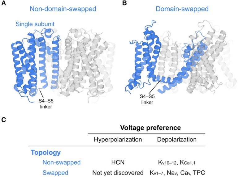 离子通道是细胞膜上的具有亲水孔道的一类疏水膜蛋白,能选择性通透不同离子(如:K+,Na+,Ca2+,Cl-等)。随着跨膜离子流动而使得通道所在膜两边的跨膜电位发生变化,进而实现神经传导,肌肉收缩,或细胞内外离子平衡。电压门控离子通道的孔道开放与关闭受细胞膜两边的膜电位调节。不同离子通道受膜电位影响的方式不一样,包括去极化(depolarization膜内电压高于膜外电压)或超极化(hyperpolarization膜外电压高于膜内电压)调节。