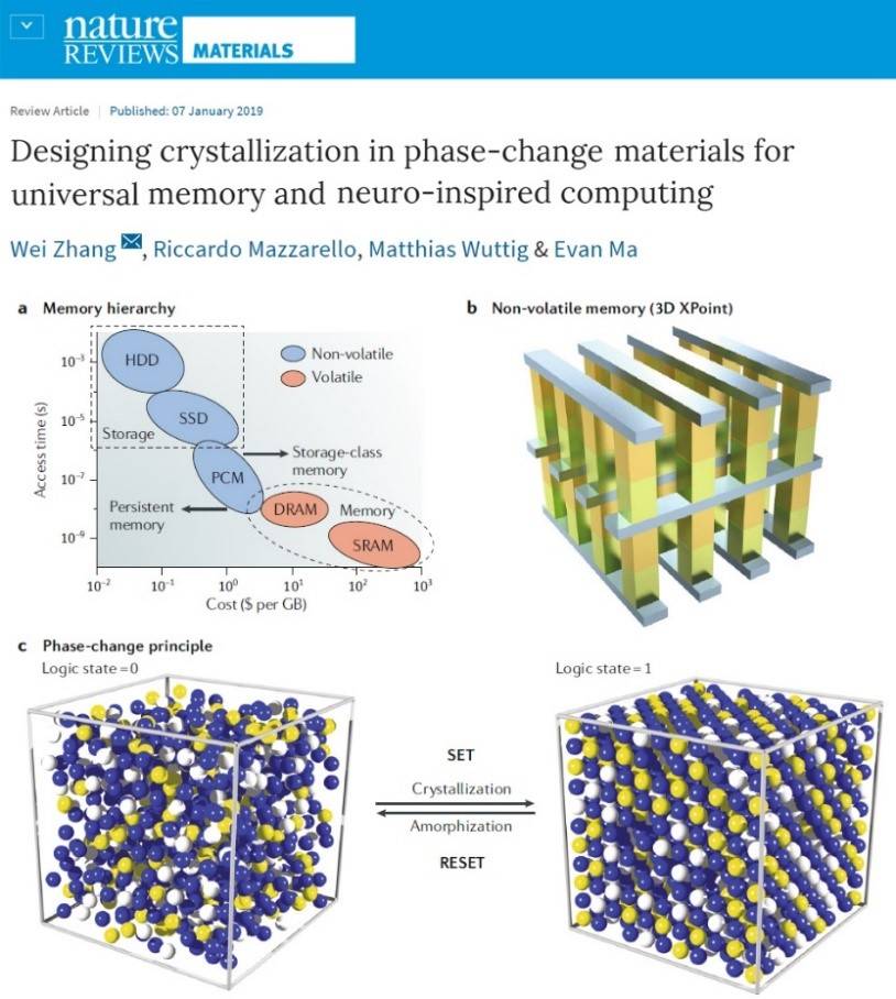 人工智能、大数据等新兴技术的蓬勃发展对现有的计算设备性能提出极大挑战。近十多年来,科学界与工业界一直致力于发展第三类存储器技术,以期在同一单元中实现数据的快速读写及稳定存储,应对数据存储与处理方面的巨大压力。基于硫族化物的相变存储器经过二十余年的科研发展,已逐步实现工业化生产,并于近期投入市场,例如英特尔“傲腾”芯片等。领域内的研究重点落在如何进一步提升相变存储的读写速度上。西安交通大学金属材料强度国家重点实验室、材料科学与工程学院微纳中心(CAMP-Nano)张伟教授课题组联合中科院上海微系统与信息技术研究所、美国约翰霍普金斯大学科研人员设计了新型钪锑碲合金,成功将相变存储器的读写速度提升十余倍并达到亚纳秒级别。