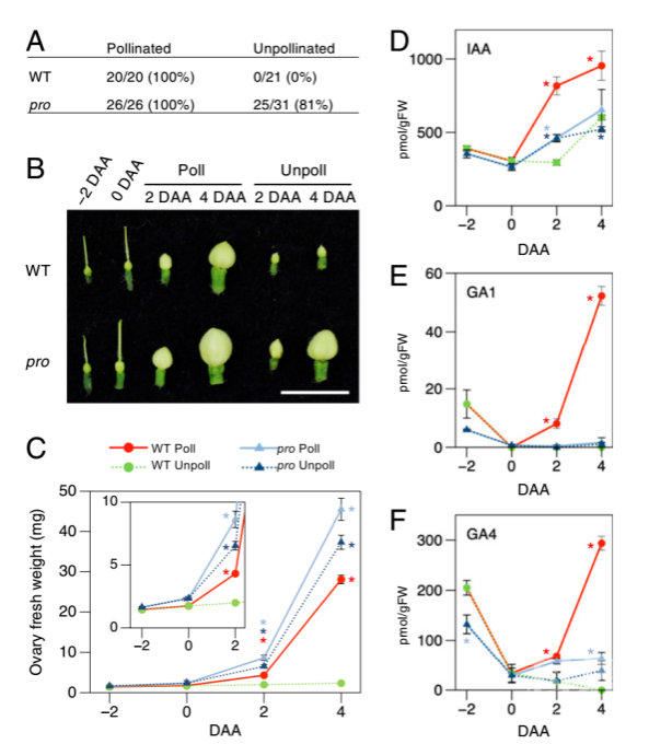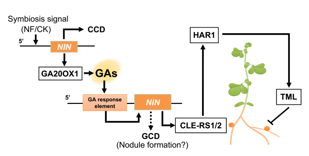 赤霉素信号途径在促进植物株高,调控开花方面具有重要作用。在植物体内赤霉素由一个复杂的多步骤途径催化合成,活性赤霉素被赤霉素受体GID1(Gibberellin Insensitive Dwarf 1)识别,继而介导一个生长抑制因子DELLA的降解。赤霉素的合成如果受到破坏会导致DELLA积累,DELLA抑制了植物生长,从而呈现矮化表型。同样的DELLA的显性获得性功能突变,使得DELLA不能被GID1介导的途径降解,同样会导致植株矮化。近代农业实践中大量使用化肥,使得作物徒长,茎干纤细,当遭遇暴风雨天气时,容易产生倒伏导致产量损失。通过调控赤霉素途径改善植物株型,首先在单子叶粮食作物中得到应用。发生在20世纪70年代的绿色革命,通过向水稻中导入赤霉素合成基因的功能缺失突变以及向小麦中导入DELLA的功能获得性突变(小麦DELLA同源基因为Rht-1),并组合一些其他的有益变异,最终提高了当时水稻和小麦的产量,多养活了数十亿人口。