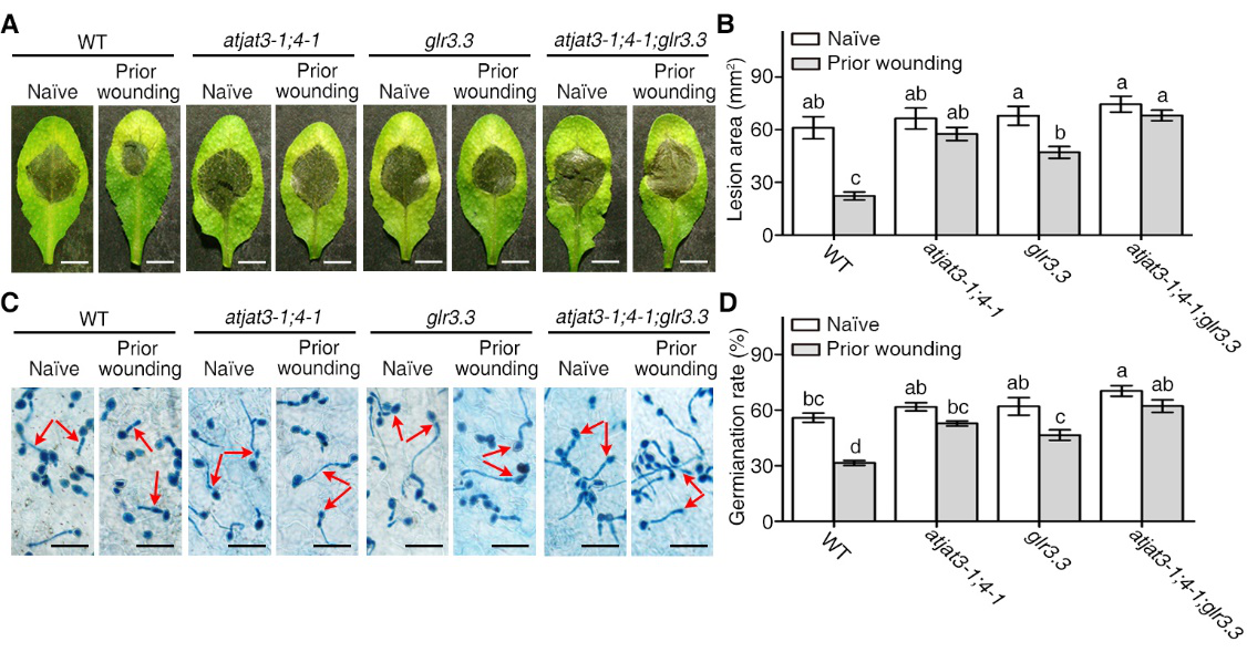 各种激素含量测定发现HL+HS诱导拟南芥JA和JA-Ile含量大幅度增加,而单独的HL或HS逆境对它们二者的含量没有影响。对JA缺乏突变体aos (allene oxide synthase)进行不同条件的处理,发现其表型与哥伦比亚型拟南芥在ΦPSII、Fv/Fm等生理参数上的趋势一致。不过其叶片损伤在HL条件下也能被观测到。与对照和HL、HS条件下之aos植株相比,HL+HS会导致叶片死亡和损伤的比例分别达到了60%和30%, 而双重逆境下的植株存活率仅有49%,远低于Col对照的75%。此外,ABA和SA缺乏突变体aba2和sid2在同等条件下的表型与对照并无显著性差异。以上结果表明JA响应通路是拟南芥耐受对高光强和高温胁迫的关键途径。
