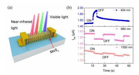 光,让整个世界姹紫嫣红、五彩斑斓。而光电探测器则是一种将光转变为易于人们识别的电信号的器件。人类的眼睛便是一种天然的光电探测器,通常人眼观测的可见光波长范围在380~780纳米之间。波长大于780纳米波长的红外光,则是人类的眼睛无法识别与辨认的“隐形光”。然而,红外光在电子通讯、安防监控、生物医疗、军工航天等领域都发挥着极为重要的作用。近日,东南大学电子科学与工程学院张彤教授团队与英国剑桥大学Daping Chu教授课题组合作提出了一种基于新型二维材料二硫化钼的全新机理的光电探测器件,首次实现了突破二硫化钼带隙的红外光探测,该项研究结果以“宽光谱响应二硫化钼场效应光晶体管:超灵敏可见光光响应和红外负响应”为题发表在材料类国际顶尖期刊Advanced Materials (《先进材料》影响因子19.791)上。