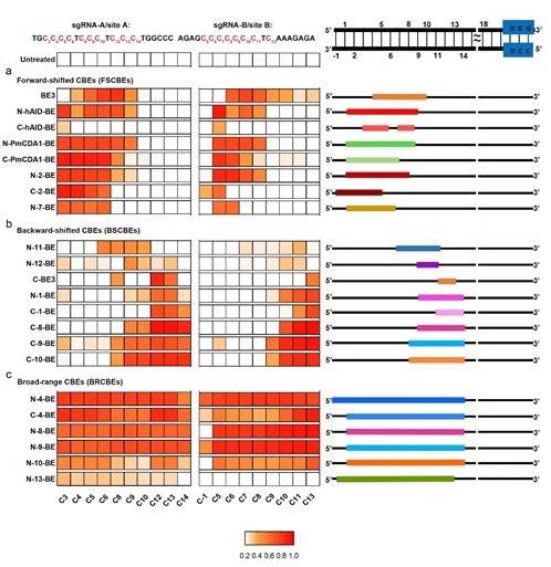 图注:CBE系统的分类,CBE系统的活性窗口定义为sgRNA中编辑效率>40%的C位点。(a) 前置型CBE(FSCBEs),其活性窗口主要位于sgRNA靶位点的前端(PAM位点看作最末端)。(b)后置型CBE(BSCBEs),活性窗口主要位于sgRNA靶位点的后端。(c)广谱型CBE(BRCBEs),活性窗口横跨sgRNA靶位点的前后端。