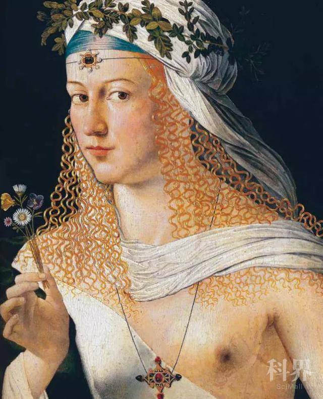 托洛梅奥 · 韦内托,《扮成花神的一名风尘女子肖像》,约1520年,木板蛋彩画和油画,43.6厘米 ×34.6厘米,法兰克福施塔德尔博物馆