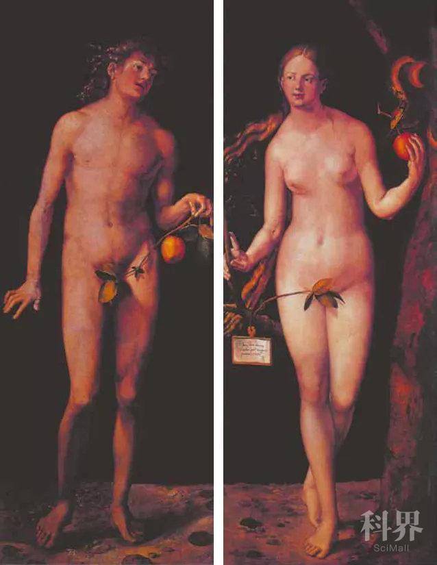 阿尔布雷希特 · 丢勒,《亚当与夏娃》,1507 年,木板油画,两块木板,各 209 厘米 ×81厘米,马德里普拉多博物馆