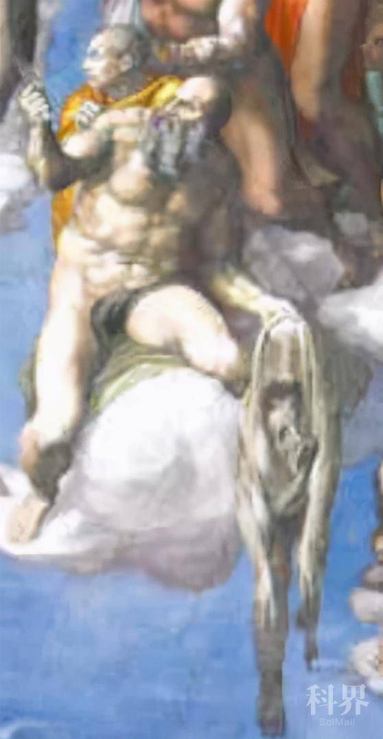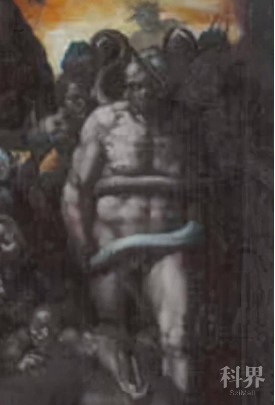 但格外讽刺的是,壁画中有一个最能表达米开朗基罗的心意,又能反映文艺复兴精神,而且几百年来丝毫没有被改动,生殖器上也没被添加贞洁纱的人物,那就是这幅作品的第一位审查者,那位第一个谴责艺术家的教宗礼仪长比亚焦·达·切塞纳。他被大师活灵活现地画进了审判的画面,以至于当时的人们可以立刻辨认出他的面容。礼仪长变成了长着驴耳朵的米洛斯,这个形象在希腊神话中代表判断力极差的人。贞洁纱在这里也发挥不了作用,因为他身上缠绕着一条大蛇,蛇头正咬住他的生殖器往下吞。这也是整个构图中不是来自《圣经》,而是来自人文主义先锋但丁的《神曲》的形象之一(《返朴》编注:参见《被但丁写进地狱的人,米开朗基罗却为他制作胸像?| 艺海拾真》)。因此,他真是壁画中最典型、最忠实、最文艺复兴的痕迹,几百年来,美术史上任何关于这幅传世杰作的文章都必定要提及他。