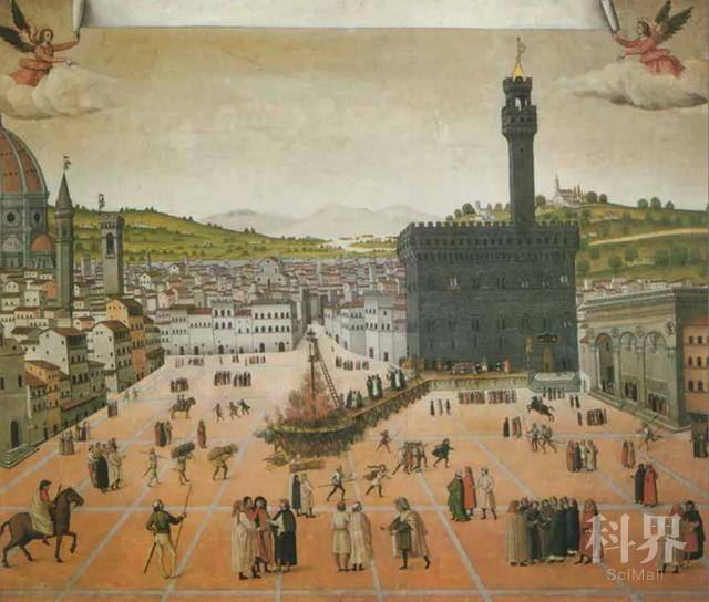 弗朗切斯科 · 罗塞利,《在领主广场上处决萨伏那洛拉及其两名同伙》,16世纪,木板油画,101 厘米 ×117 厘米,佛罗伦萨科尔西尼美术馆