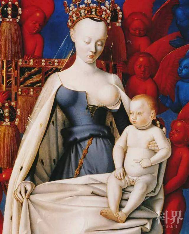 让 · 富凯,《天使环绕的圣母与圣子》,约1454 ~ 1456年,木板油画,94.5 厘 米 ×85.5厘米,安特卫普皇家美术馆