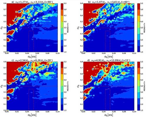 紫金山天文台研究团队分别采用数值模拟和理论分析方法,对该系统存在两颗行星的情况开展了深入的动力学演化和稳定性特征研究。考虑相对论效应和潮汐效应的情况,动力学演化结果表明:在一百万年左右的时间尺度上,Proxima b的轨道偏心率演化受到潮汐的影响很小,而相对论效应对两颗行星的影响比较明显。不考虑相对论效应和潮汐效应的情况,利用MEGNO积分器对系统稳定性的研究,描绘出了该系统稳定区域的整体图像(图2),揭示了两颗行星在共面和非共面时保持系统动力学稳定的行星参数限制。对于共面情况,内、外两颗行星的偏心率上限分别为0.4和0.65,此时Proxima b的半长轴范围为0.02 -0.1 au;对于非共面情况,两颗行星的轨道倾角低于50度。这些研究结果不仅有助于开展该系统的长期动力学形成演化及其形成机制研究,而且为后续系外行星的观测提供重要的理论参考。