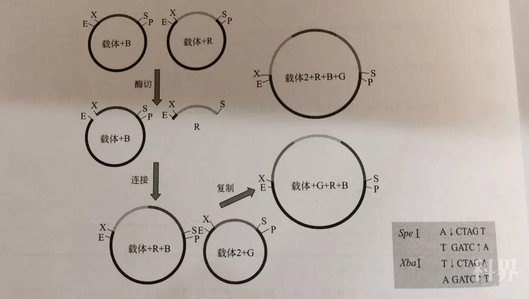 每一个生物积块都具有相同的前缀和后缀,前缀中包括EcoRl和Xbal两个酶切位点,后缀中包括Spel和Pstl两个酶切位点。有了上述4个酶切位点,需要组装的部分分为插入片段和载体两部分。