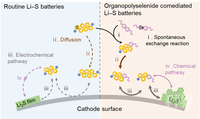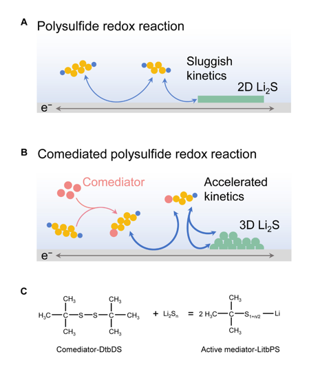 图1. Li–S电池的反应路径示意图。(a)常规Li–S电池中的多硫化物介导的反应路径和(b)氧化还原辅介体调控下的反应路径示意图。(c)氧化还原辅介体与多硫化锂之间的化学反应式。