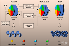 常规核小体的结构包括一个由四种组蛋白H2A、H2B、H3、H4组装而成的蛋白核心,一条在组蛋白核心上缠绕1.6圈,长度为147 bp的双链DNA。核小体结构非常稳定,对DNA组成和组蛋白修饰的改变均不敏感。组蛋白变体可以改变核小体和染色质结构调控基因转录,迄今为止测定的所有单核小体结构中,构象改变最大的CENP-A核小体就是组蛋白H3变体核小体,结构显示CENP-A核小体包含的DNA为121bp,但其蛋白核心结构变化不大。组蛋白H2A变体H2A.B和H2A.Z.2.2分别在精原细胞和人脑组织中特异表达,在精子发生、转录起始、RNA剪切等过程中具有重要功能。H2A.B和H2A.Z.2.2形成开放的核小体结构,并"破坏"染色质结构,导致染色质松散。但是这种开放的核小体极不稳定,难以获得高精度结构。