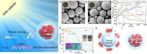 左图:光热相变微胶囊太阳能存储示意图;右图:a,b分别为黑磷在微胶囊表面、内部扫描电镜表征;c图为微胶囊材料光热转换及存储温度-时间曲线;d图为模拟光热相变微胶囊实际应用效果图;e,f图为两种光热相变微胶囊能量存储机理图。