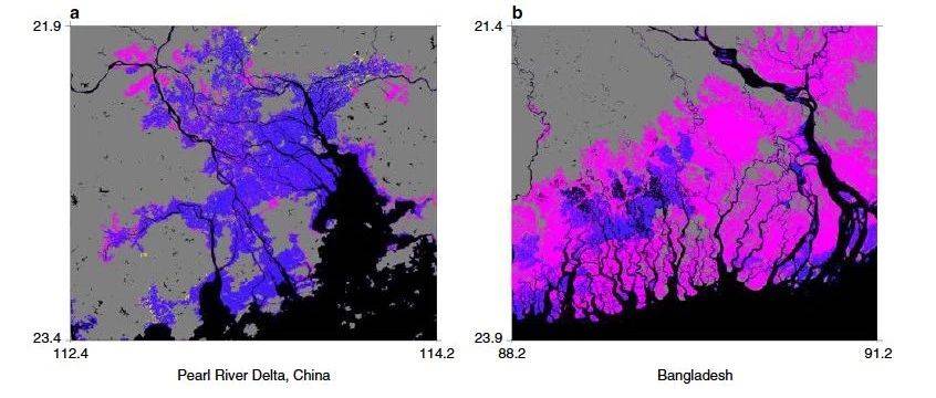 研究人员将海滩分为两类——一类是与低洼沿岸平地、盐碱地或是浅泻湖相接的海滩,另一类是倚靠坚硬的海岸悬崖或工程结构(如海堤)的海滩。前者虽然可能会随着海平面升高被拔高,逐渐向陆地迁移,但不太可能走向“灭亡”。只有后者确有可能在未来消失,因为它们首先会经历“沿海挤压”,宽度随之变小,最终完全被淹没。