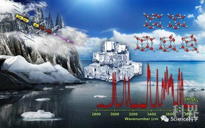 江凌和杨学明团队利用自主研制的中性团簇红外光谱实验装置在研究中发现,中性水分子八聚体(H2O)8的红外光谱呈现出冰的光谱特征。此外,李隽研究组采用自编的TGMin程序结合高精度的量子化学理论方法,计算出水分子八聚体的各种稳定结构和红外光谱,理论结果与实验结果高度吻合,说明这些最小冰立方是由8个水分子组成的水团簇。