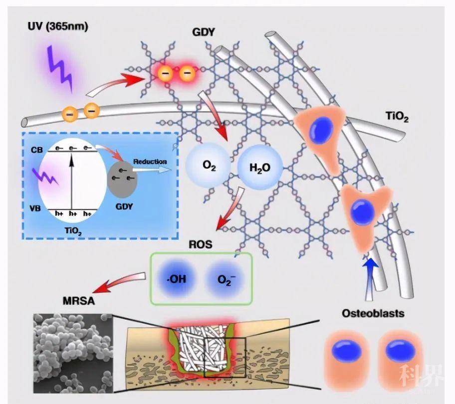 数十年来,骨科植入物引起的感染增加了植入物失败的风险。虽然TiO2具有产生活性氧(ROS)的光催化活性,但产生的电子与空穴的复合限制了其抗菌能力。