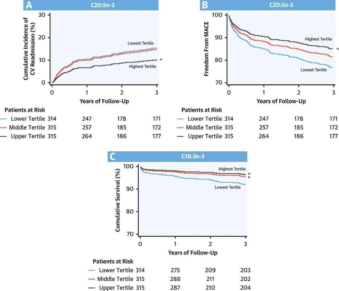 统计分析表明,在调整年龄、性别、合并疾病史等因素后,3年前血液中EPA水平较高(前1/3)的人,MACE风险显著降低24%,心血管原因再次入院风险显著降低26%;3年前血液中ALA水平较高也与全因死亡率下降35%有关,ALA水平也显示出了降低MACE风险的趋势,但尚不显著。