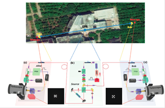 2014年,在发展使用全新超高亮度纠缠源技术的基础上,配合自主研发的高分辨时间-数字转换(TDC)系统,研究团队在实验室中成功实现了超高损耗下的贝尔不等式检验。实验中纠缠光子对被分发到两个测量端,并模拟了总共103dB的超高损耗,每个测量端由实验者独立、随机地选择测量基矢,最终在关闭自由选择漏洞下观察到了贝尔不等式的违背,为未来在地月系统中开展量子非定域性的终极检验迈出了坚实的一步。
