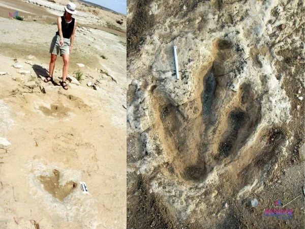它看上去像人的脚印,其实是一个大恐龙的后脚和前脚靠得太近,形成了脚印的痕迹。