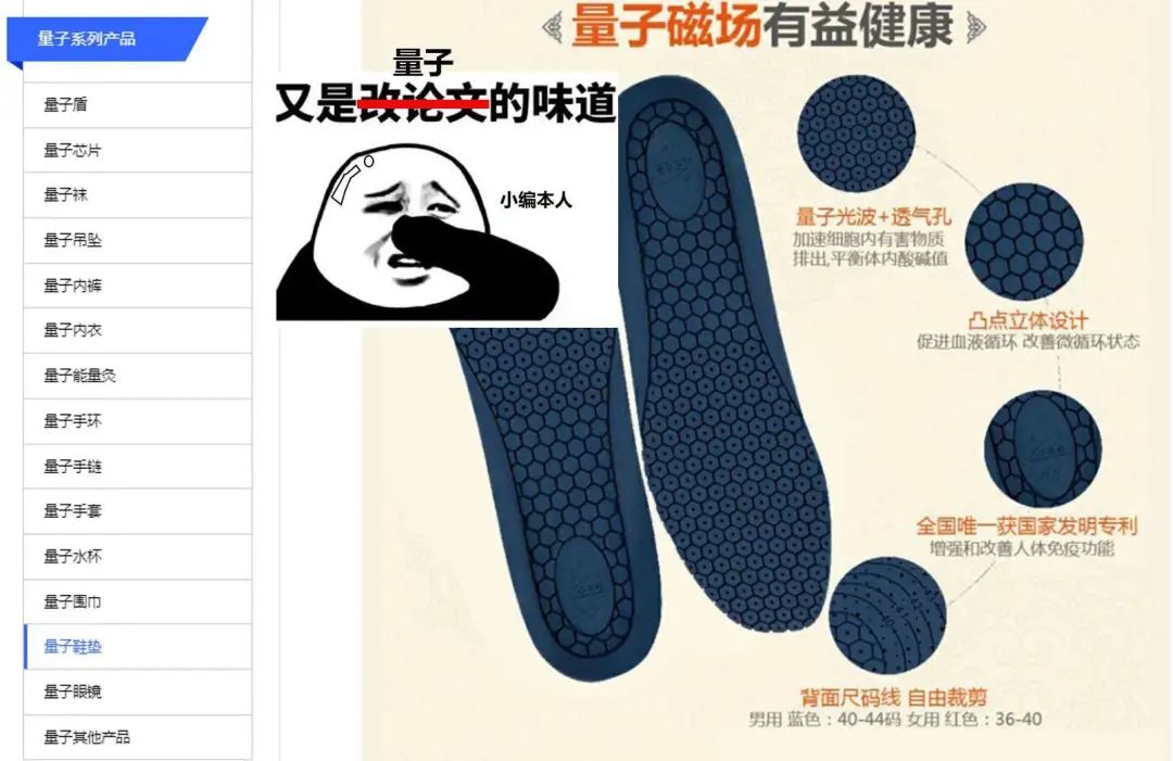 哎,不懂量子力学不要紧,小编看完只希望看完这篇的小伙伴至少让长辈们别再给量子概念交智商税了,动动手指转发到家庭群里去,不转不是……小编随手一搜“量子鞋垫”,第一条就是一家号称拥有量子科技的公司,什么量子鞋垫、内衣、袜子就都……量子了?
