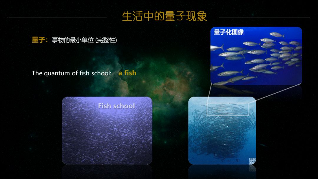 曹则贤老师比喻得很好,我们生活中的可以见到的感知到的事物,包括光和能量的最小单位都能称之为量子。就像我们远处看鱼群是乌央乌央的一片黑,但是放大了看就是一只一只的鱼,这就可以说是鱼群的量子。