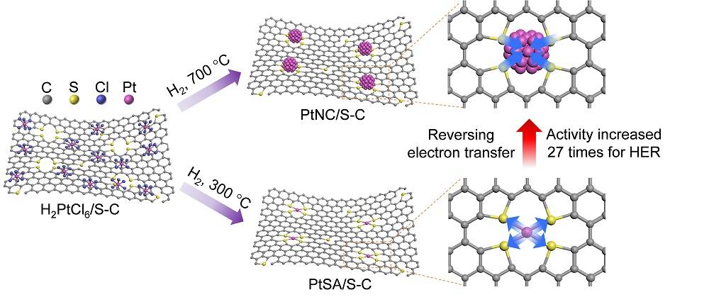 图1. S-C负载的Pt单原子与Pt纳米团簇合成示意图以及电荷转移变化。