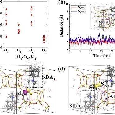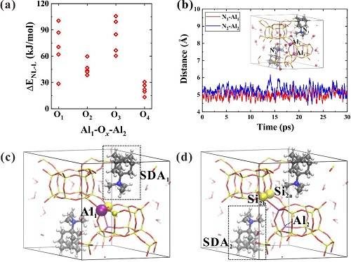 在该研究工作中,研究人员通过吸附三甲基氧膦(TMPO)探针分子,将“NMR不可观测”的骨架三配位铝物种变为“NMR可观测”的扭曲四配位铝物种。通过二维27Al多量子和二维31P{1H}异核相关实验观测到探针分子吸附的H-ZSM-5分子筛上存在三种不同的Al物种和多种吸附在不同酸位的31P NMR信号。进一步结合前期自主开发的灵敏度增强的异核相关NMR实验方法(J. Chem. Phys. 2015, 142, 094201),获得了TMPO探针分子中“磷”与分子筛骨架上“铝”的二维31P-27Al异核相关谱,明确了H-ZSM-5分子筛中存在两类由骨架三配位Al构成的Lewis酸物种,其含量占总酸性位含量的11.6 %。另外,研究人员利用二维27Al-27Al同核双量子相关实验结合DFT理论计算进一步证实了分子筛骨架Lewis酸(骨架三配位铝)和Brφnsted酸(骨架四配位铝)之间存在空间临近和协同效应,从而导致Brφnsted酸位的酸性增强,形成“超强酸位”。