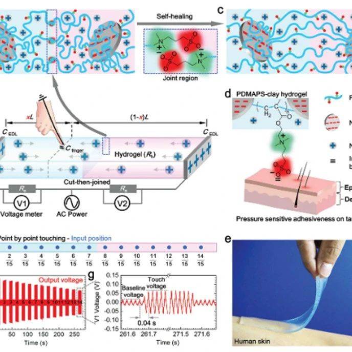 这样的水凝胶是在纳米粘土([Mg5.34Li0.66Si8O20(OH)4]Na0.66)水溶液中原位聚合两性离子单体(3-[[2-(甲基丙烯酰氧基)乙基]二甲铵基]丙烷-1-磺酸盐(DMAPS))合成的。其中的可移动离子为Na+(图1a)。聚合物/粘土间的非共价吸附交联作用,以及聚合物分子链上的正负电荷基团吸引,赋予水凝胶自修复功能(图1b-c)。两性离子基团与皮肤等被粘物的极性相互作用,赋予其可逆粘附性(图1d-e)。研究人员采用表面电容触控(SCT)技术,首先构建了1D水凝胶触摸条(图1f-g)。其电路搭接方法如图1a:在水凝胶条两端分别接电极、外部电阻,再接入交流电源。手指定位原理如下:手指触碰凝胶时,与凝胶间形成耦合电容(Cfinger),因此,电流可以经手指接地,形成通路;凝胶可看作电阻(Rh),该电阻被手指分为左、右两部分,各部分电阻值与其归一化长度(x、1-x)成正比;左、右两部分凝胶电阻并联,且分别串联一个外部电阻(Re),然后接入同一交流电源;因为并联电路两端电压相等,所以,当手指移向凝胶右侧,则右侧凝胶分得的电压减小,而右侧外部电阻上电压增大,相应地,左侧凝胶分得的电压增大,左侧外部电阻上电压减小;从而,根据外部电阻上的电压值可以确定x值,即手指位置(图1f-g)。