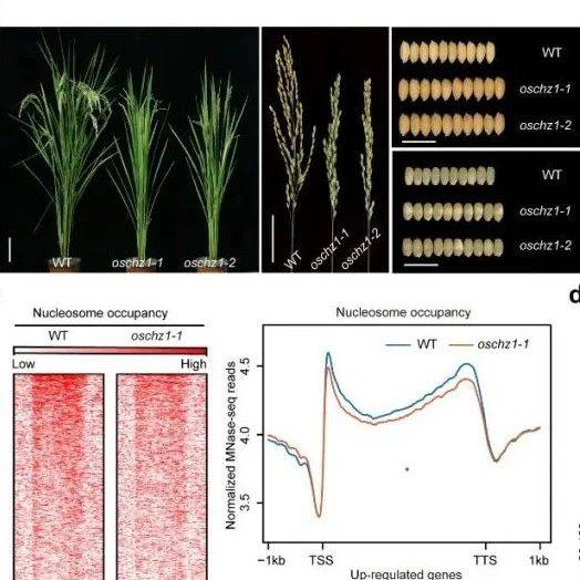 a. OsChz1缺失导致水稻多种生长发育缺陷;b. OsChz1-H2A-H2B复合物的晶体结构c. OsChz1缺失导致全基因组范围核小体密度的下降;d. OsChz1缺失导致全基因组范围H2A.Z的富集水平下降
