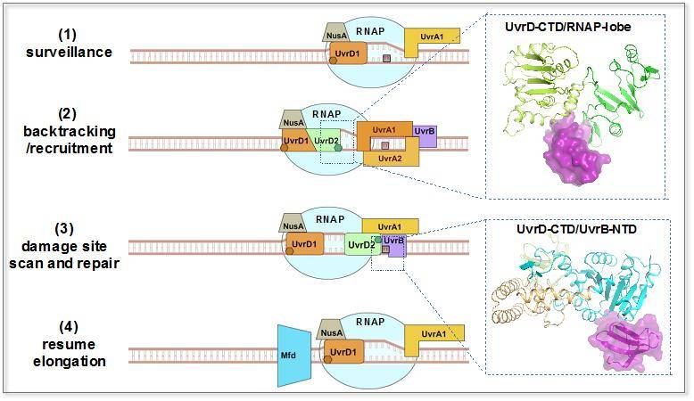 研究发现BmrR与CueR类似,二者均结合在启动子DNA的两个关键区域(-35区和-10区)之间,使双链DNA在四个位置发生了弯折,特别是位于转录因子二聚体中心的位置,DNA发生了约90度的弯曲,使19bp的-35/-10间隔区域重新压缩到了17bp的物理距离,优化了非活性启动子DNA的结构,使其能够被RNA聚合酶正常识别。另外,结构还显示CueR以及BmrR除了与DNA相互作用外,并不会与RNA聚合酶相互作用。因此,通过解析具有MerR家族中具有代表性的两亚类转录因子的转录激活复合物结构,统一了该大家族的转录激活机制,提出其绝大多数成员均通过仅改变DNA构象的机制实现转录激活。