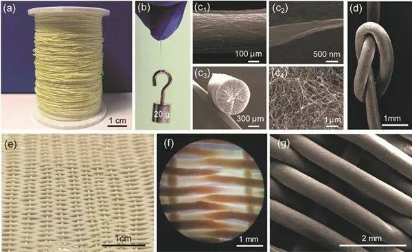 图1(a)PVDF/PI气凝胶制备过程示意图。(b, c)PVDF/PI气凝胶的微观结构照片。(d)PVDF/PI气凝胶可置于花蕊顶部,展示其轻质的特点。(e)不同形状的PVDF/PI气凝胶。(f)染色水滴在PVDF/PI气凝胶表面,说明其良好的疏水性。(g)高温高湿环境中PVDF/PI气凝胶的数码照片(左)和红外热成像图(右)。在潮湿环境和300°C热台上,PVDF/PI气凝胶表面温度仅为56.9°C。