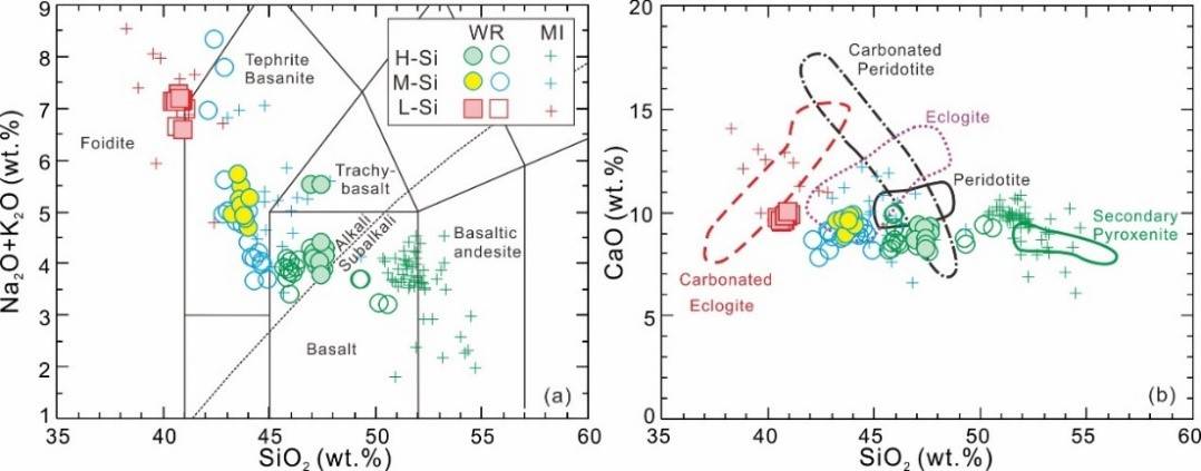 目前缺乏对新的六方铝相、铁酸钙相、超斯石英相、赛石英以及后钙钛矿在高于300 K条件下的地震性质的实验数据,而对瓦兹利石的测量也只达到1073 K。即使是研究最多的下地幔矿物铁方镁石,关于铁自旋转变对其弹性性质的影响以及压力对体弹模量的软化作用仍然存在不确定性,更关键的是缺乏高温下穿过铁方镁石自旋转变区域声速的实验测量数据(图2b)。此外,关于地幔中次要矿物相(如碳酸盐、含水矿物相和熔体)弹性性质的实验研究仍然非常少。