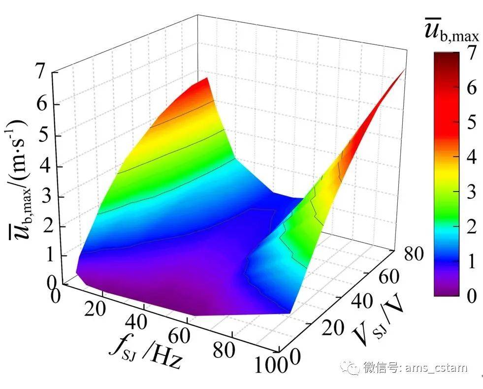 结果显示,吹气在一个完整的合成射流周期中占据主导地位,其对外界环境的影响强于吸气。激励频率 f = 5 Hz 和 f = 100 Hz 对应着更高的吹气速度,使得分布式合成射流的参数空间显示出一种“两边高,中间低”的马鞍形状,如图1所示。