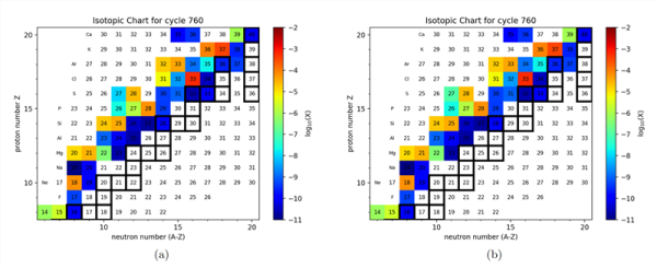 研究人员通过将增强的3α反应率植入到中微子质子俘获过程的脚本,使用天网核合成演化计算网络,进行海量场景的计算。结果显示,核合成被强烈抑制。